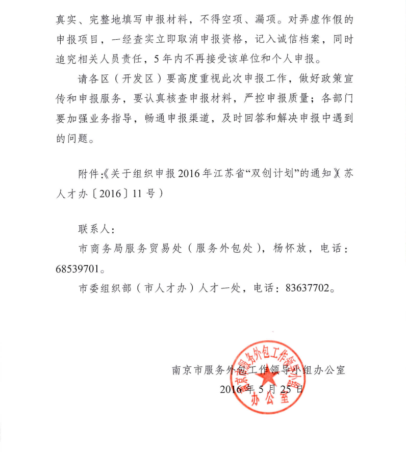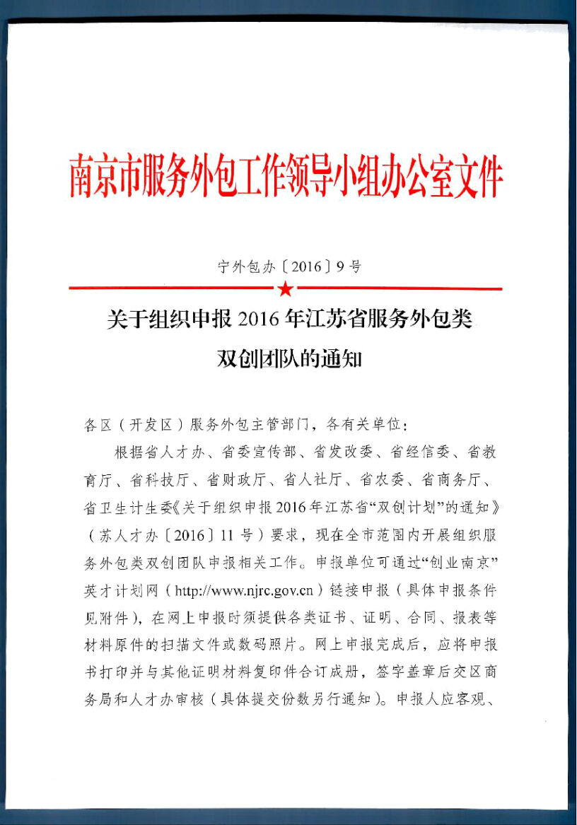 關(guān)于組織申報(bào)2016年江蘇省服務(wù)外包類(lèi)雙創(chuàng)團(tuán)隊(duì)的通知